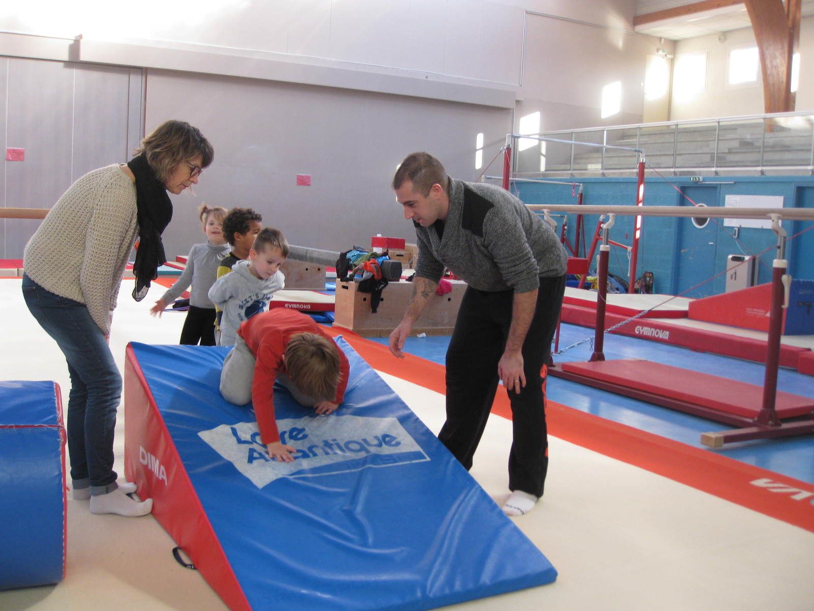 Les MS découvrent les agrès de la salle de gymnastique : la poutre, le trampoline, les espaliers, les tremplins, les tapis, les plans inclinés…